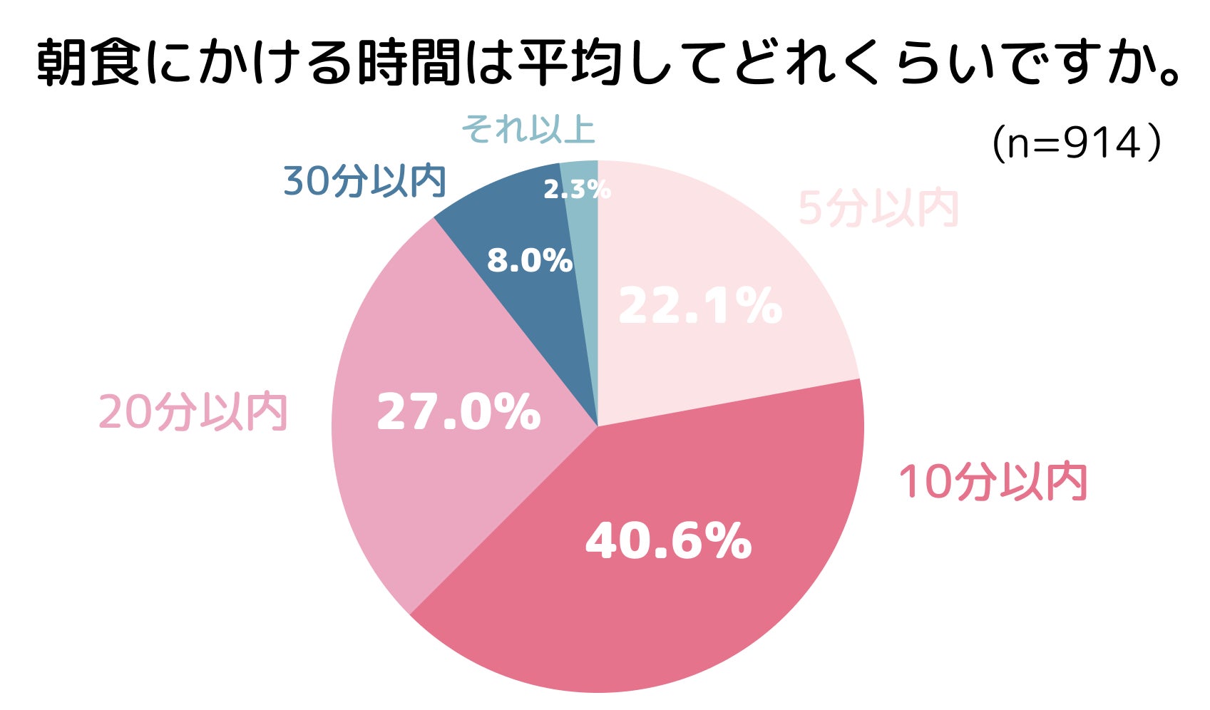 朝ごはんに使う時間は、「10分以内」が最も多く、40.6%となりました。89.7%の人が20分以内に朝ごはんを終わらせています。