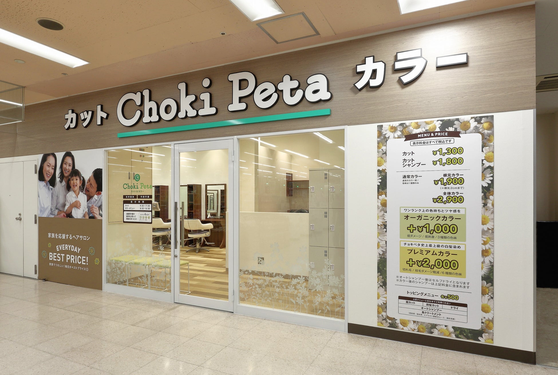 チョキペタは「ちょっと髪が伸びてきた」「白髪が気になる」というときに便利な、カットとカラーのメンテナンス専門店です。お気に入りの髪型をキープするのに便利で、7割を40代~60代の女性が占めています。料金は、カット1,300円、前髪カット500円、すぐに伸びてしまう白髪の根元染めは根元から2cmまで1,900円、全体のカラーは2,900円~とお手頃な料金設定です。