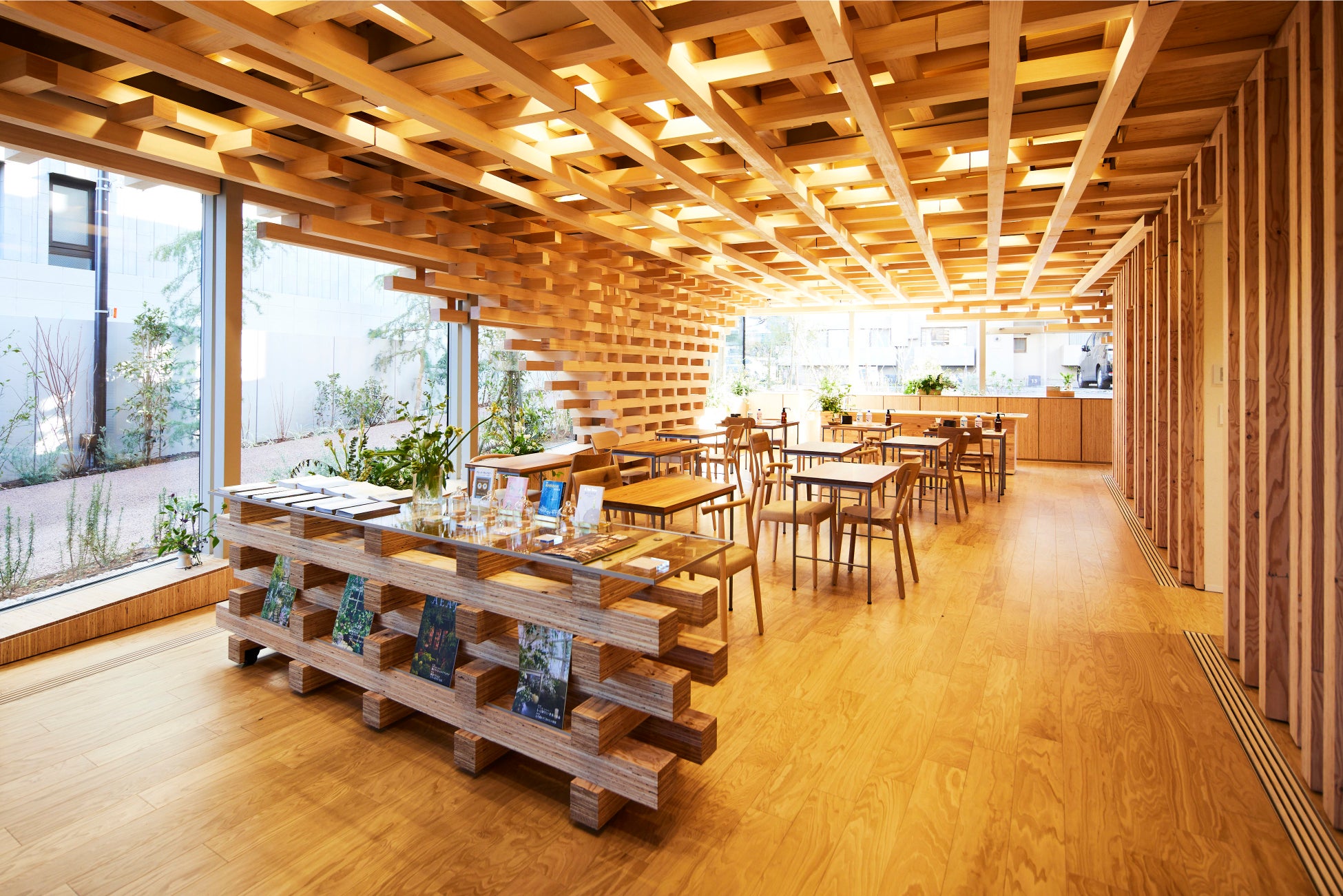 国産ヒノキの組積構造が印象的な空間は、建築家 隈研吾氏によるもの。植物の恵みである精油がもつ力と可能性を、さまざまなコンテンツを通してご紹介します。