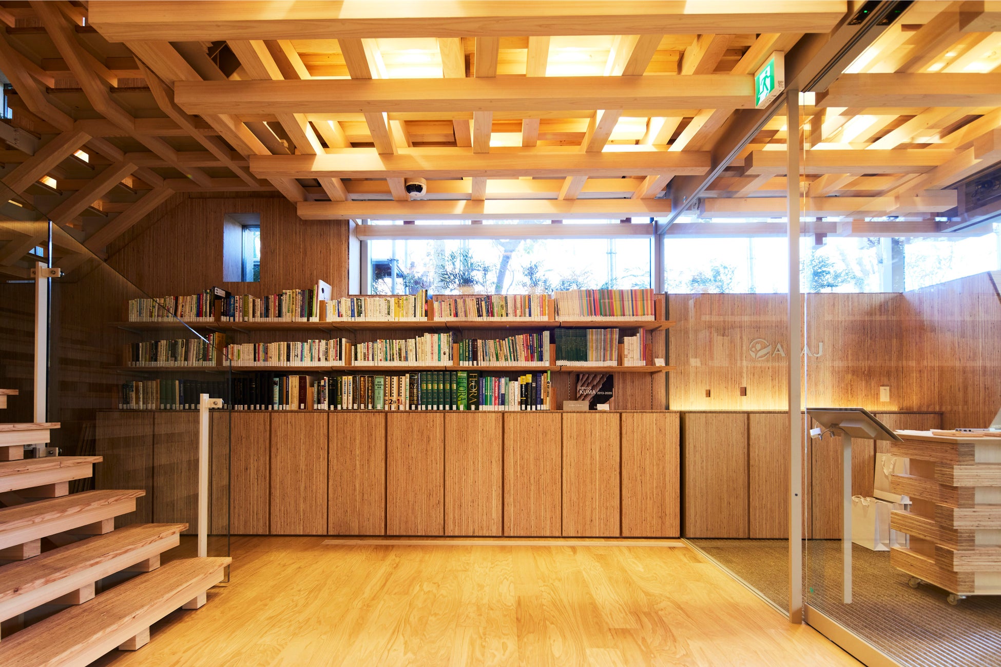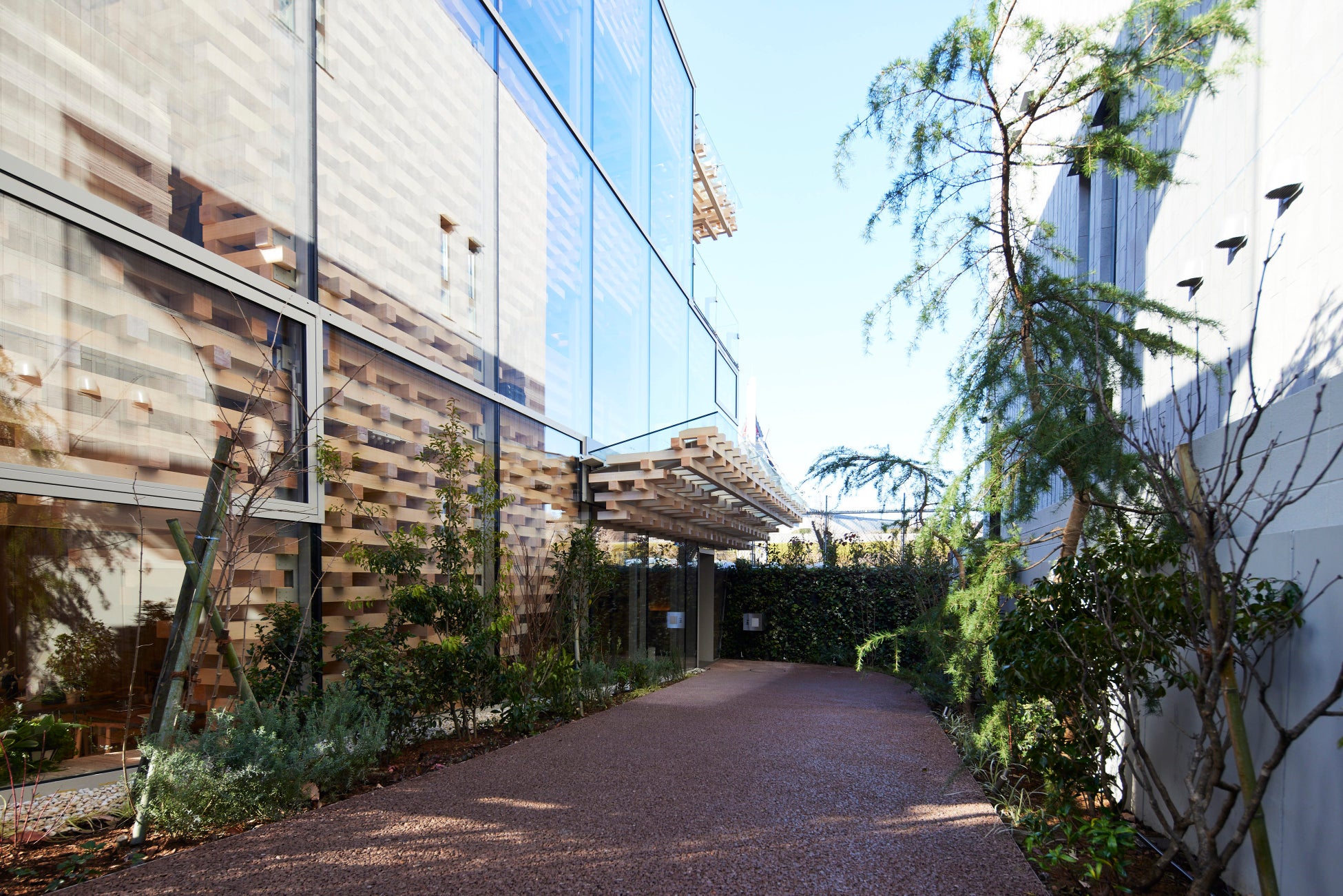 「AEAJグリーンテラス」は、人々の心身の健康に寄与し、アロマ環境の保全と創造を図るAEAJの活動のシンボルとなるよう、建築の設計は木材をさまざまな方法で利用したデザインが印象的な隈研吾氏に手掛けていただきました。そこに集う人々の健康と快適性、そして未来の自然環境保全のため、 国産のヒノキやクリ、カラマツといった木材を最大限使用しています。