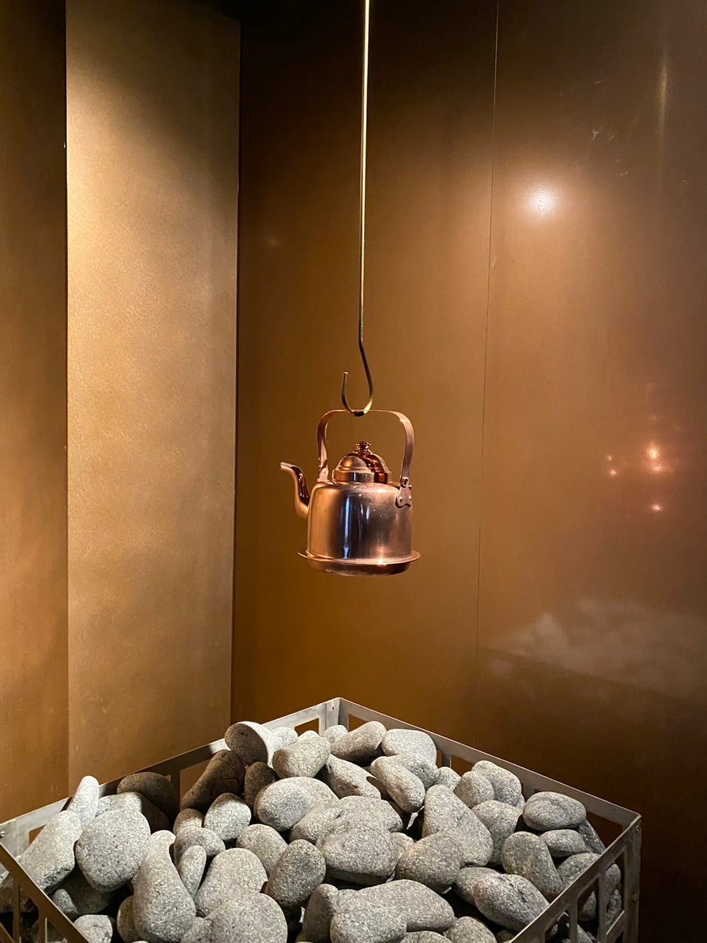 「クロウナ」は、“穴蔵”をイメージして仕立てた、サウナでは珍しい真っ黒なサウナ室。外界からの光を遮った地下のような暗さの中で、自分の世界に静かに没入していくような時間を過ごしていただきたいという発想から、黒一色で仕上げました。ストーブにはやかん型のアロマポットを設置。セルフロウリュを楽しみながらじっくりと汗をかいていただけます。