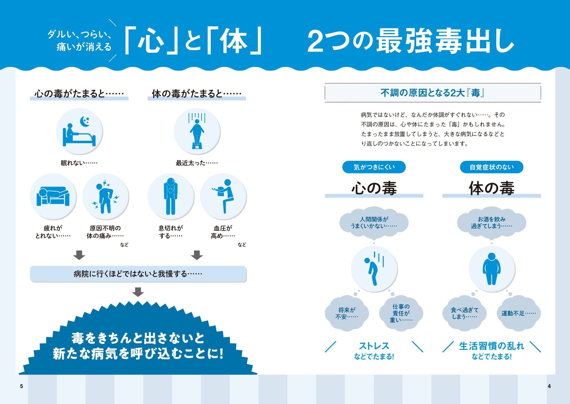 本書ではこころやカラダの健康法などで数々の著書を持つ、健康の専門家である医師・工藤孝文先生が提案する、誰にでも簡単にできる“毒出し法”を紹介します。
