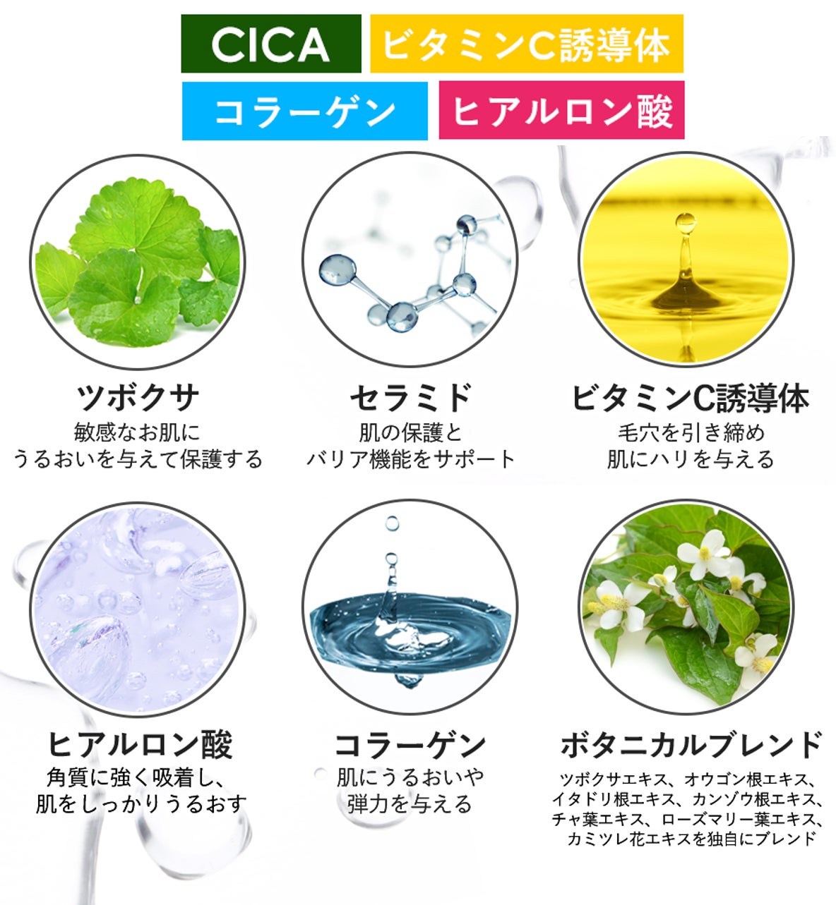 アレルギーテスト済。パラベン・合成香料・合成着色料・紫外線吸収剤フリー。バリア機能サポート成分、3種のセラミド、CICA(ツボクサ)、ヒアルロン酸、コラーゲン、ビタミンC誘導体、ほか話題の美容成分を贅沢配合。