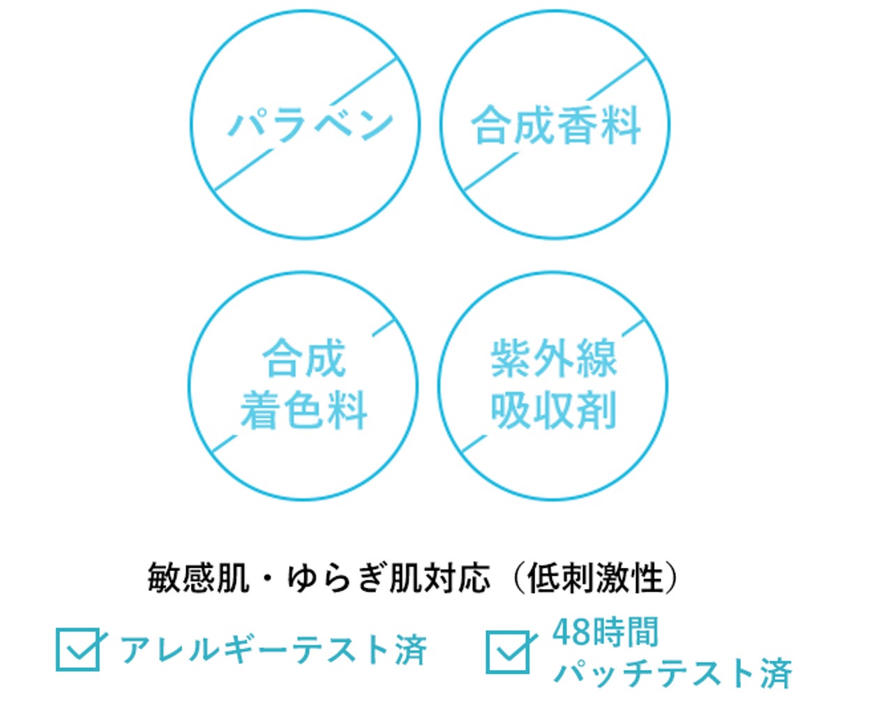 アレルギーテスト済。パラベン・合成香料・合成着色料・紫外線吸収剤フリー。バリア機能サポート成分、3種のセラミド、ヒアルロン酸、コラーゲン、ビタミンC誘導体、ほか話題の美容成分を贅沢配合。