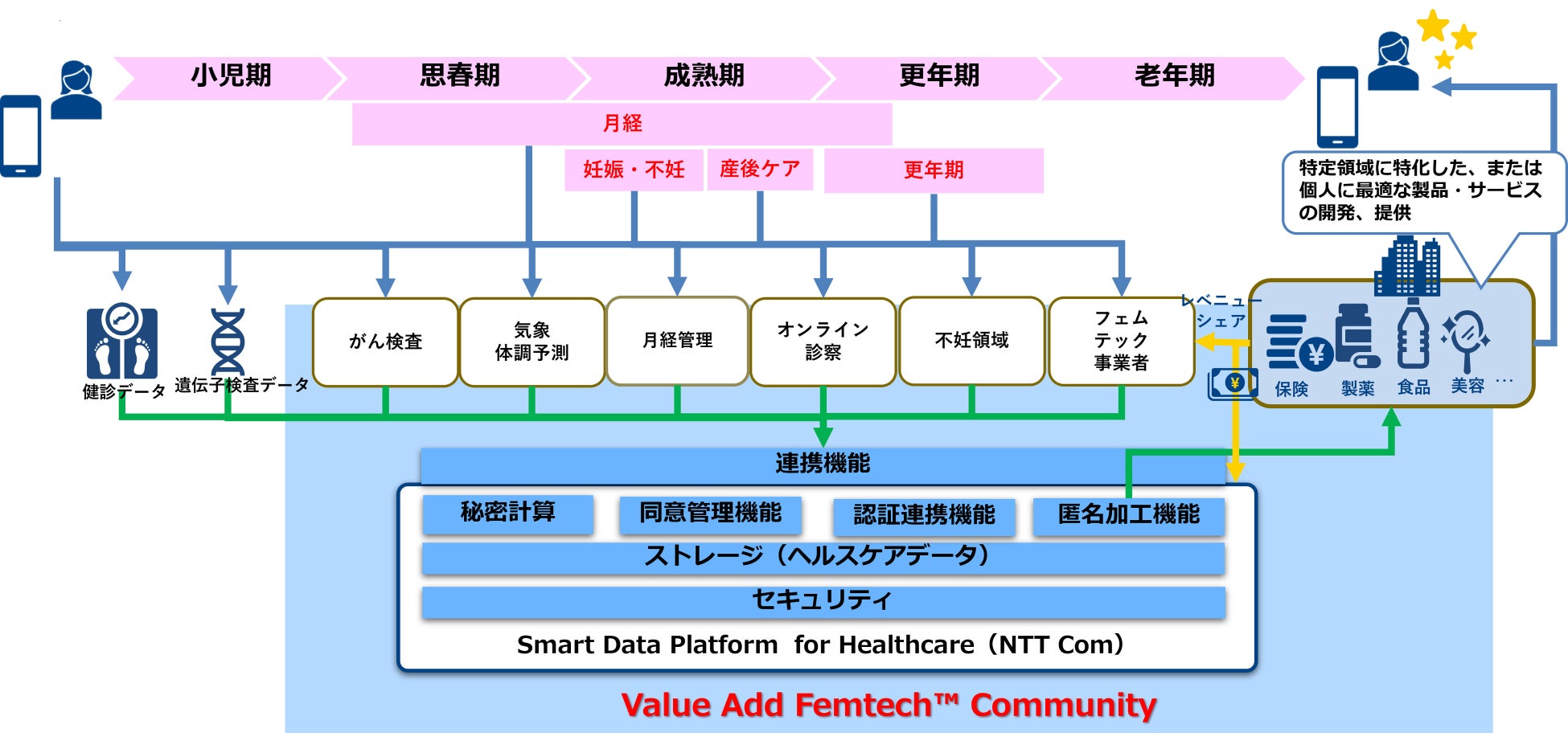 『Value Add Femtech™ Community』は、NTT Comが提供するヘルスケア業界向けプラットフォーム「Smart Data Platform for Healthcare」(以下 SDPF for Healthcare)を活用して、様々なフェムテックの事業者間でのデータ連携、利活用により新たな高付加価値製品、サービスの開発や提供を行い、エンドユーザである女性のQuality of Life(QOL)の向上を目指す事業者間コミュニティです。
