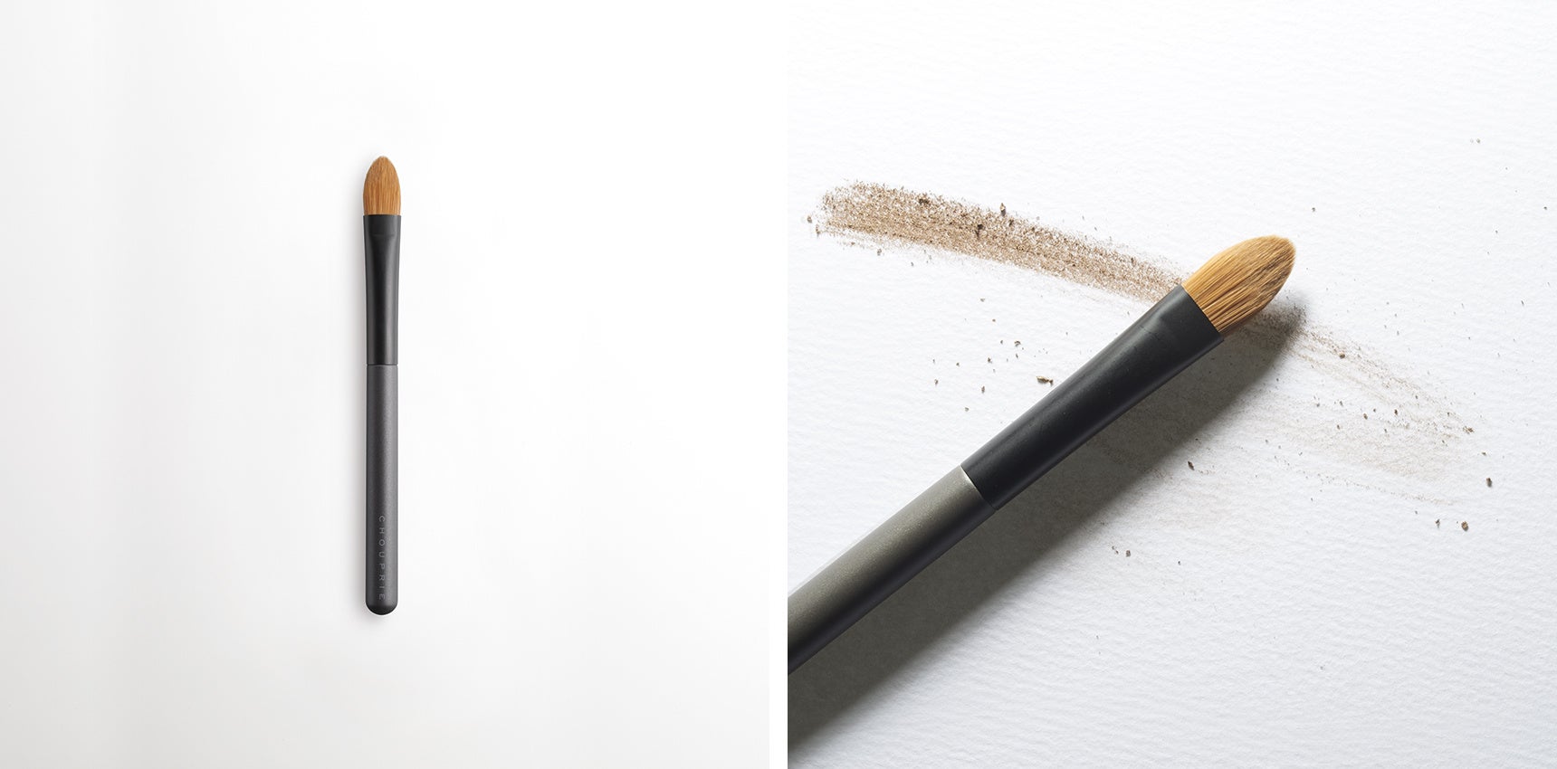 アイホール全体やポイント使いにも使える先端がとがったラウンド型のアイシャドウブラシ。粉含みが良く、まぶたにぴったりフィットし、しっかりと発色させるマルチなブラシです。