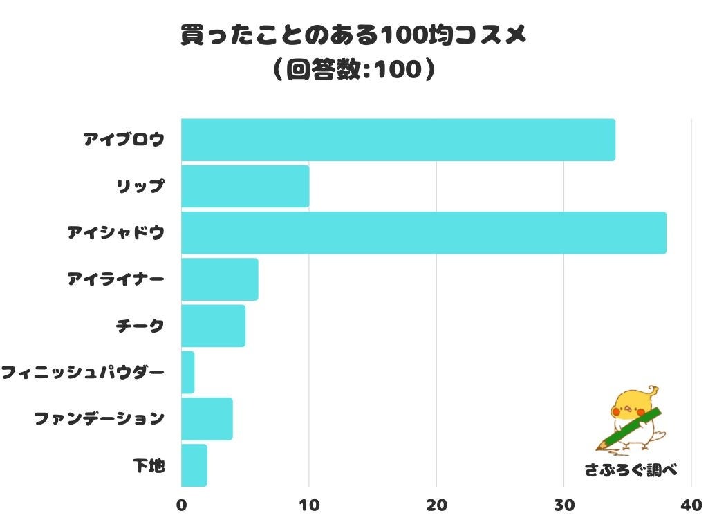買ったことのある100均コスメをアンケートにて調査したところ、1位は「アイシャドウ」でした。