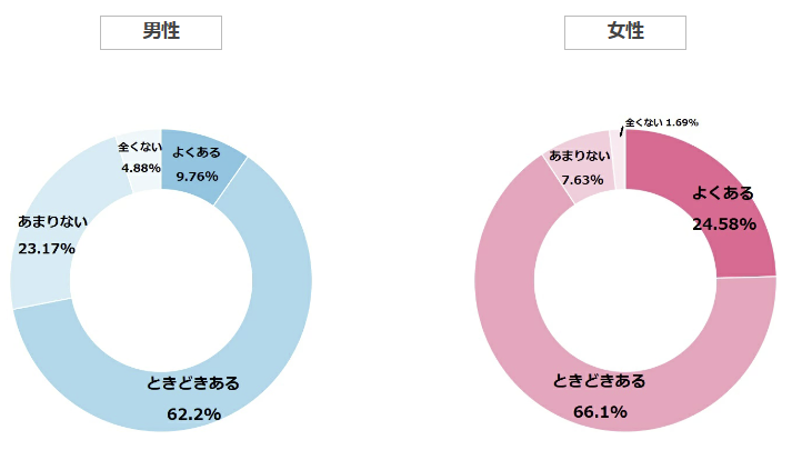 男女別で見てみると、“よくある”が男性で9.76%なのに対して、女性では24.58%と、2倍以上もの開きが出ています。 “よくある”“ときどきある”を合わせた数値で見てみると、男性71.96%に対して女性が90.68%もの高い数値になっています。
