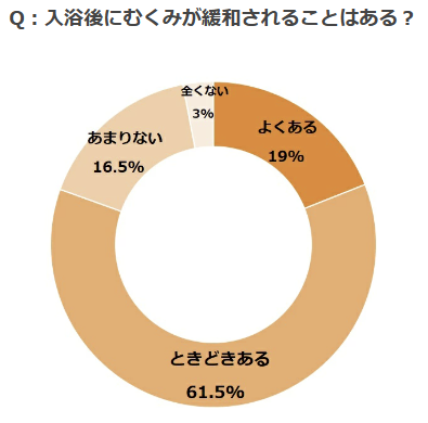 実際お風呂には温熱効果や静水圧効果などの血流UPに繋がる効果があり、全身のむくみ解消に非常に有効な手段となります。 実際どのくらいの人がそのお風呂の効果を感じているかというと、以下の通り、実に8割もの人が「むくみが緩和されることがある」と回答しています。