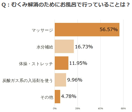 効果のあった対策としては、“マッサージ”がトップで3割程度。 続いて“湯舟に浸かる”が25%で、トップと良い勝負の数値となっています。