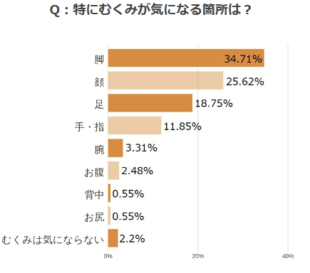 特にむくみが気になる箇所としては、脚が34%とトップで、続いて顔・足となりました。 心臓から遠い箇所である脚・足は血流が滞りがちで、長時間同じ姿勢でいたり運動不足であったりすると、どうしてもむくんでしまします。 この“むくみやすい箇所”については男女ともに順位も数値もほぼ同率で、大きな違いは見られませんでした。