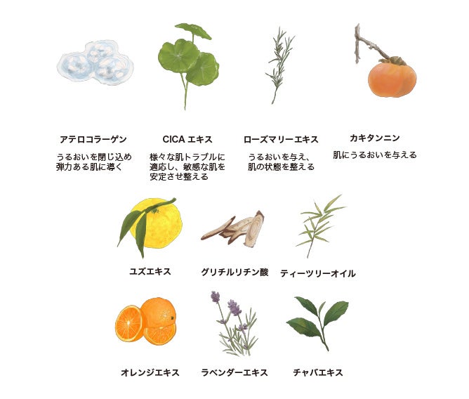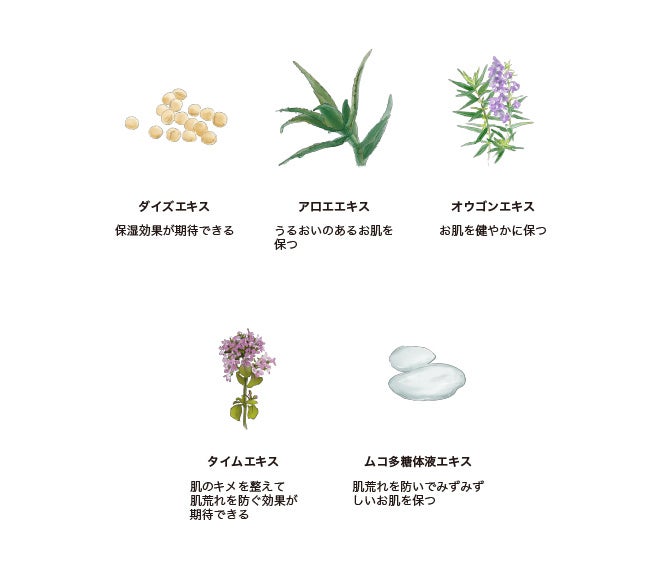 肌にうるおいを与える5つの植物エキス配合。