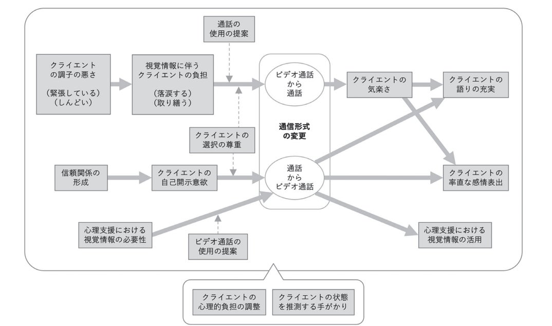 これらの結果は、音声通話とビデオ通話のような複数の通信形式を適切に使い分けることで、面接体験が改善することや、通信形式の変更に関わるコミュニケーションを通して、カウンセラーがクライエントの状態を査定できる可能性について示唆するものです。