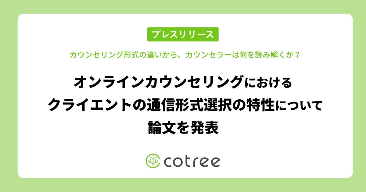 オンラインカウンセリング・コーチングの「cotree」を展開する株式会社cotree(本社:東京都港区、代表取締役:西岡恵子、以下cotree)は、東京大学大学院教育学研究科博士課程に所属する三枝弘幸氏とともに「オンラインカウンセリングにおける通信形式の選択プロセス」に関する共同研究を行い、論文を発表しました。