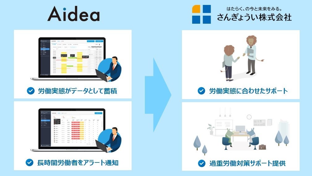 - 『Aisea Crew』の過労リスクアラートにより把握した長時間労働者に対して、さんぎょうい株式会社の提供する過重労働対策(医師面談等)や不調者の対応、働き方改革についてなどの産業保健サービスを受けることができます。