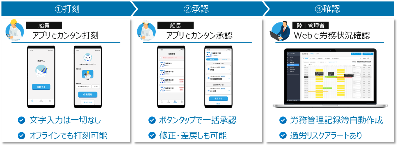 - Aisea Crewは、船員向けアプリと陸上管理者向けWebシステムを通じて、カンタンかつ適切な労働時間管理業務を実現するサービスです。