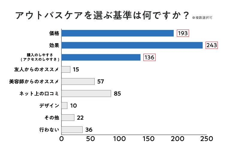 アウトバスケアアイテムを選ぶ基準としてにTOP3は1位効果、2位価格、3位購入のしやすさとなりました。