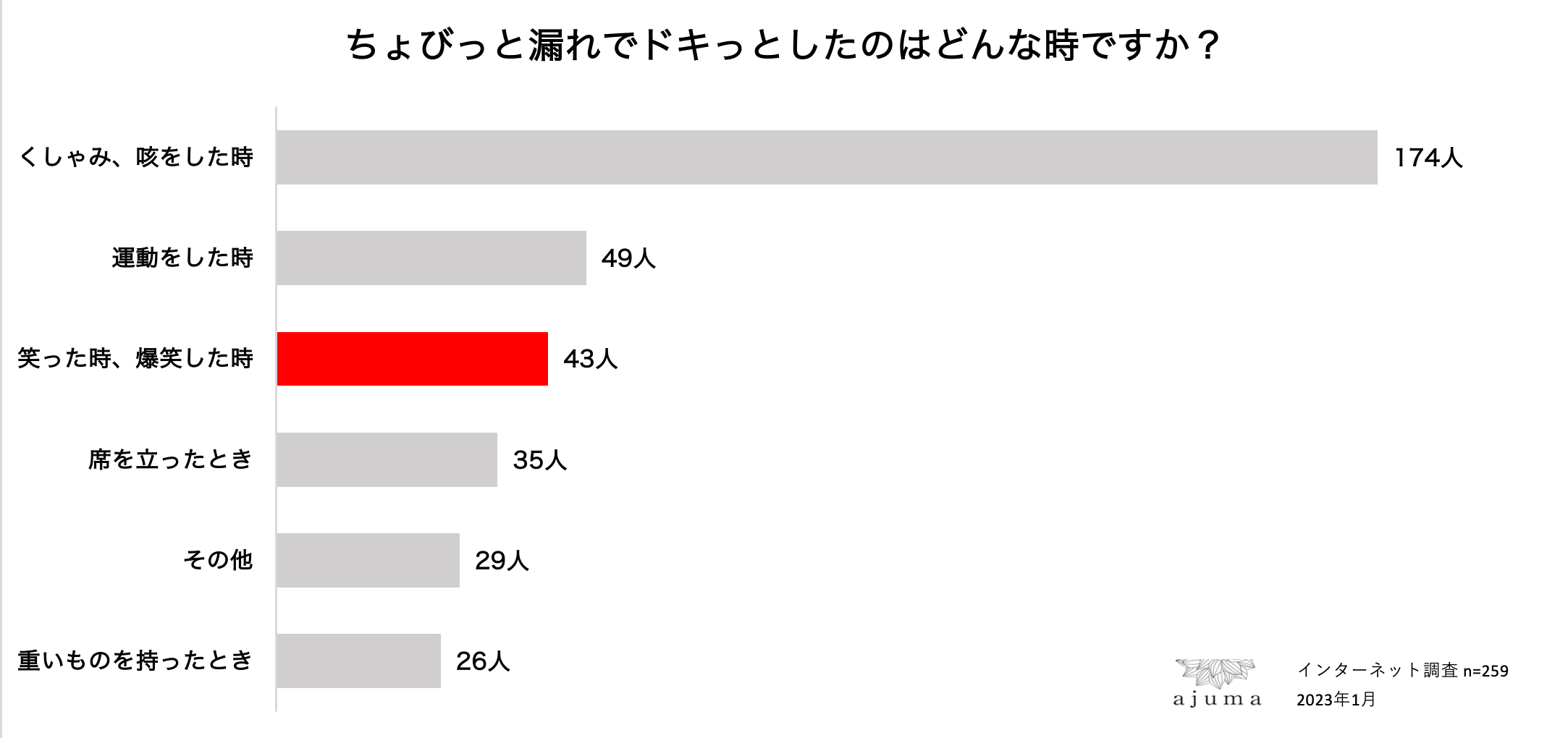 20〜60代女性300人に行った調査では、「今までにちょびっと漏れでドキっとしたことがある」と答えた女性は87%となりました。6人に1人が「笑い漏れ」、ママの38%が「ジャンプ漏れ」、ランナーの22%が「ランニング漏れ」を経験していることがわかりました。