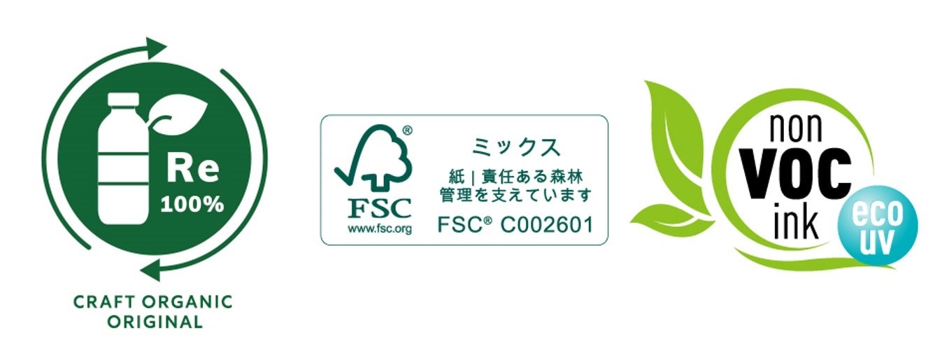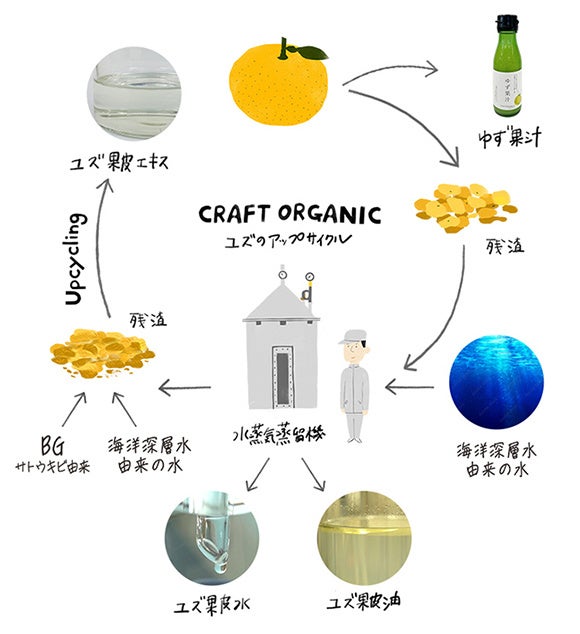 CRAFT ORGANICでは未利用資源を積極的に有効活用し、農業廃棄物を資源に変えています。例えばユズは、農家の方が大切に育てたユズを余すことなく、種から皮までまるごと活用しています。ユズ果汁を搾ったあとに残る果皮などを活かし、水蒸気蒸留法でユズ果皮水、ユズ果皮油を抽出。さらに通常は廃棄される蒸留後の果皮などから、ユズ果皮エキスを抽出。こうして生まれたユズ由来の成分は、髪や肌にうるおいを与え、爽やかな香りを出す役割を担います。その他、容器は飲料用プラスチックボトルを100%リサイクルした再生PETなどを使用。パンフレットなどの印刷物には、持続可能な形で木材を利用するためFSC認証紙を、さらに、印字には人体や自然環境に有害となるVOC*が発生しないUVエコインキを可能な限り採用。持続可能な社会を築いていくため、私たちにできることから取り組みます。