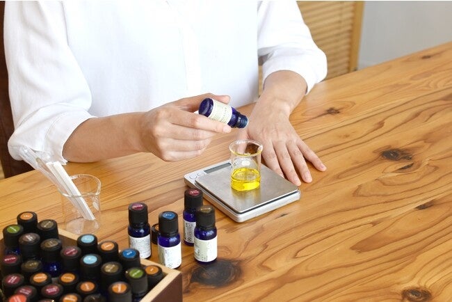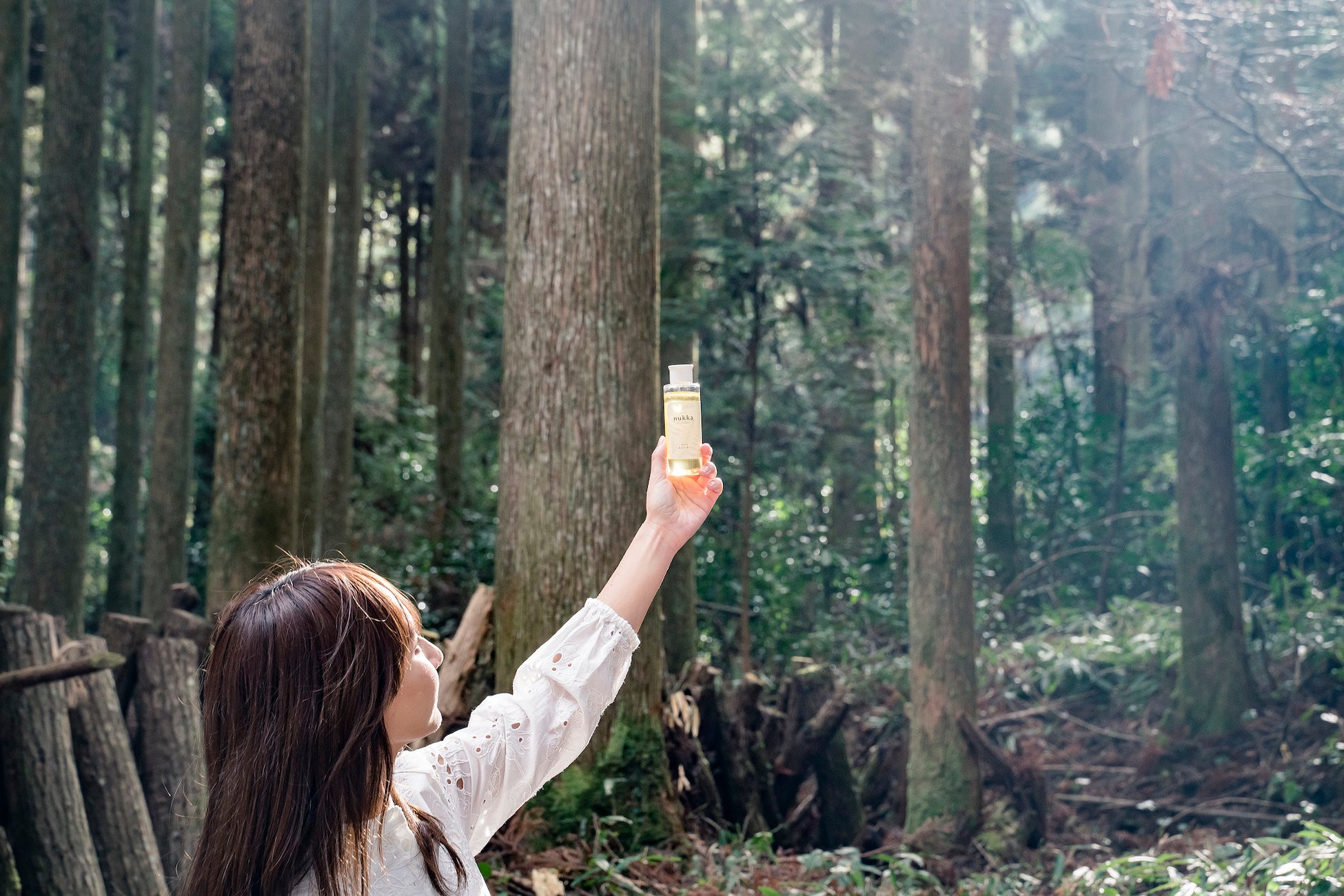今回使用する小国杉エッセンスオイルは、活用できずに山に捨てられている杉の葉を集め、長い時間かけて抽出することで新たな価値を見出しました。里山の香りを追求するにあたり、このオイルを軸に天然精油のみで調香しています。