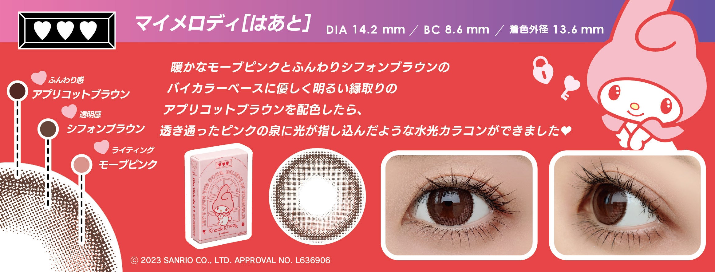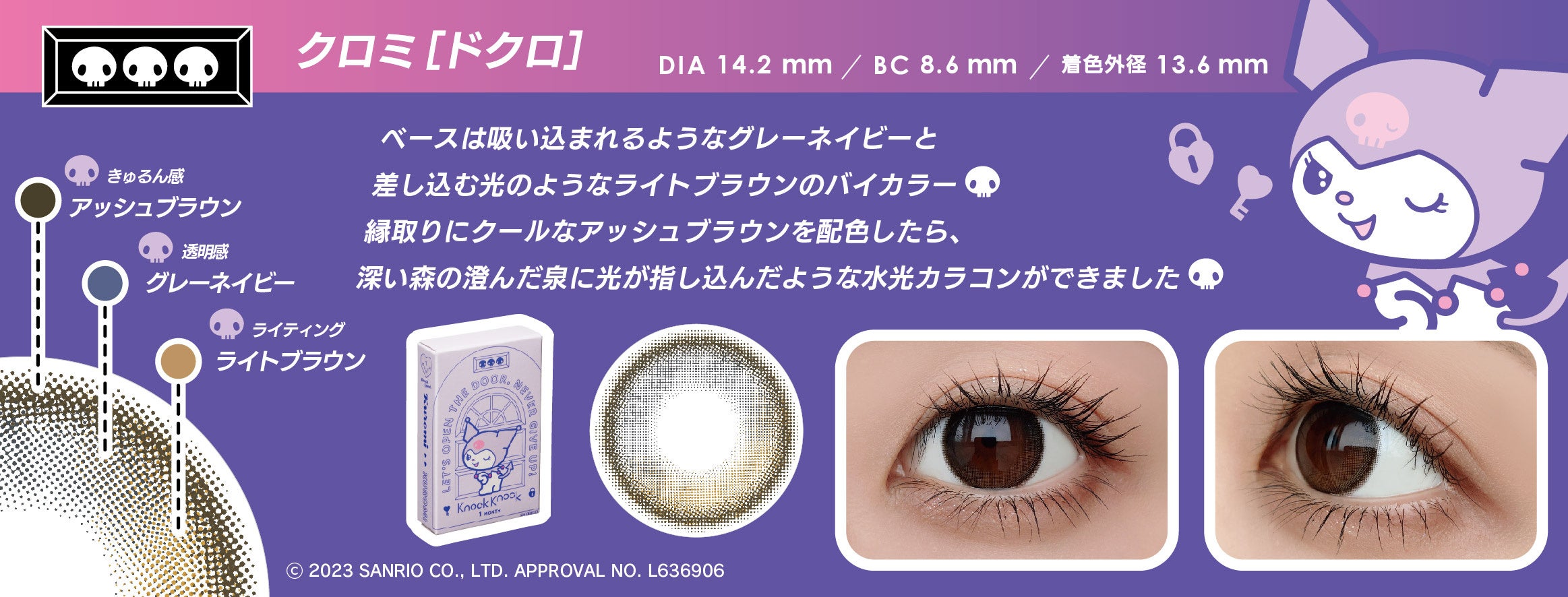 化粧雑貨、化粧品、服飾雑貨、及びキャラクター雑貨等の企画・製造・販売、コンタクトレンズの企画・販売を行う粧美堂株式会社(本社:東京都港区、代表取締役社長:寺田正秀、以下粧美堂)は、コンタクトレンズブランドKnock Knock(ノックノック)と株式会社サンリオのキャラクター「クロミ」「マイメロディ」コラボシリーズ、1month タイプのカラーコンタクトレンズ4 種を、2023 年1 月25 日に発売いたします。