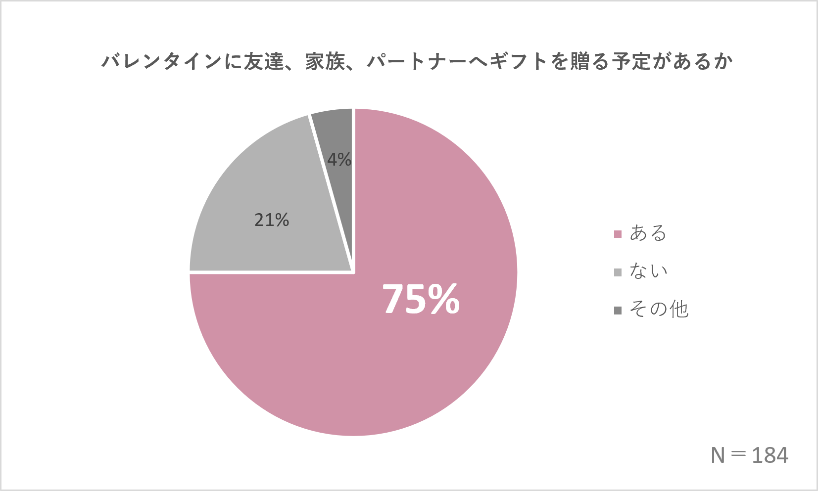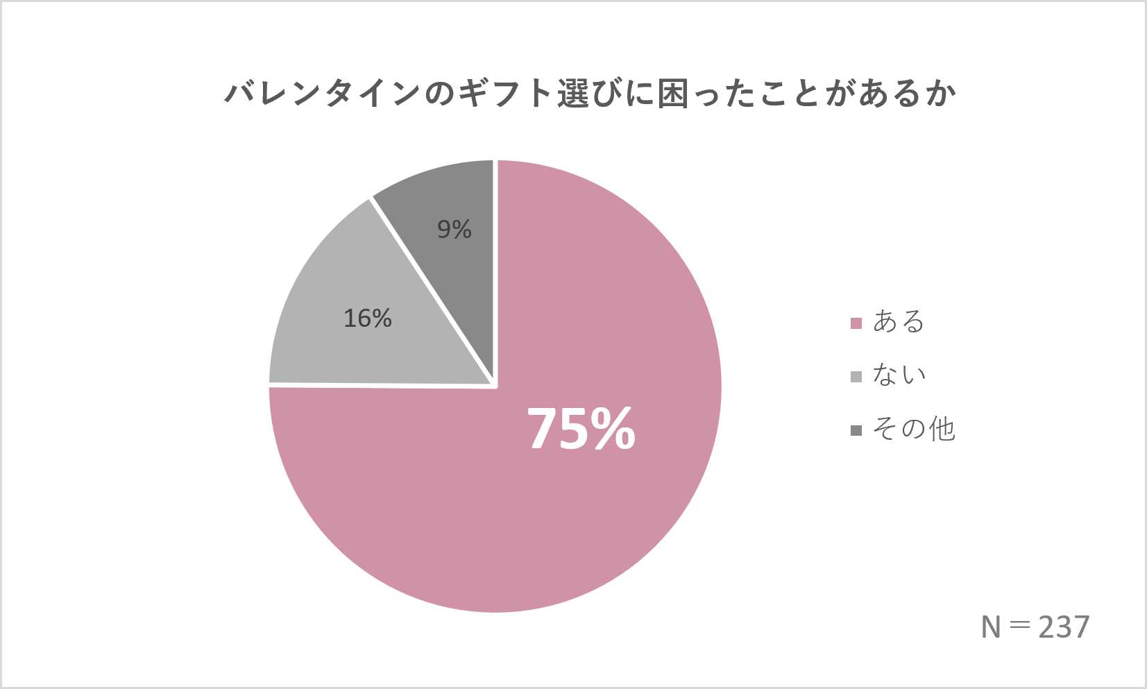 はじめに、どれだけの人がバレンタインにギフトを贈る予定があるのかをリサーチ。「バレンタインに友達、家族、パートナーへギフトを贈る予定があるか」という質問に対して75%の人が「ある」と回答しました。では、ギフト選びに関してはどうでしょうか。「バレンタインのギフト選びに困ったことがあるか」という質問に対し、予想どおり75%以上の人が「ある」と回答。スイーツに限らず多くの選択肢があるため、何を選ぶべきか困っている人が多いようです。では今、何が人気なのでしょうか?