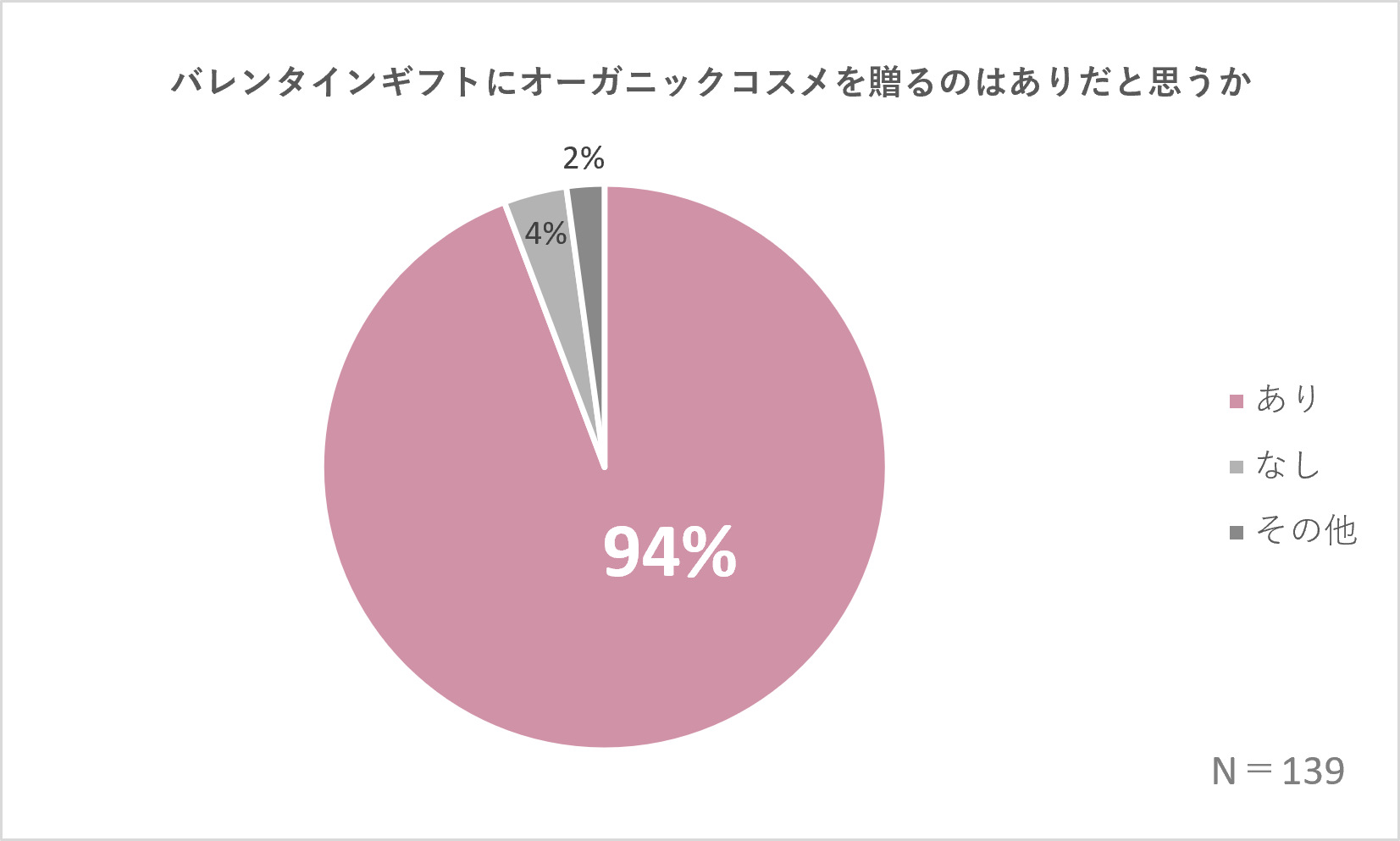 『@cosme』※1の調査によると、Z世代を中心にコロナ禍での化粧品プレゼントの機会が増加しているとのこと。そこで、最後の質問では「バレンタインギフトにオーガニックコスメを贈るのは『あり』だと思うか」を聞いてみました。すると、実に90%以上の人が「あり」と回答。多くの人が、オーガニックコスメをバレンタインのギフトに選ぶことを好意的に感じているようです。