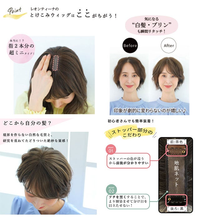 そんな声を取り入れ40代~の大きな悩みである“白髪カバー”に重点を置き、従来のウィッグ(かつら)のイメージとはちがう、極薄・軽量・3Dミニタイプの“まるで自分の髪のようにとけこむウィッグ”をコンセプトにした新ブランド「レオンティーナ」が誕生。