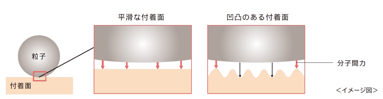 隙間のない均一な塗膜に、わずかに凹凸を形成して接着面を少なくすることで、肌表面に花粉や微粒子等の大気中の汚れが付着するのを物理的に防ぎます。※1