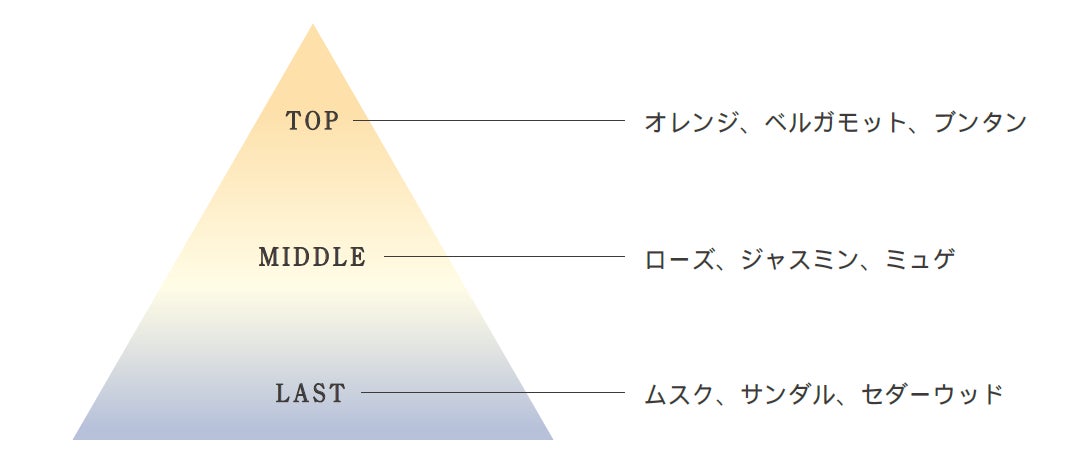 ラストノートはムスク、サンダル、セダーウッドの温かみのある香りが余韻を残します。