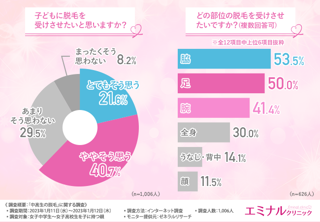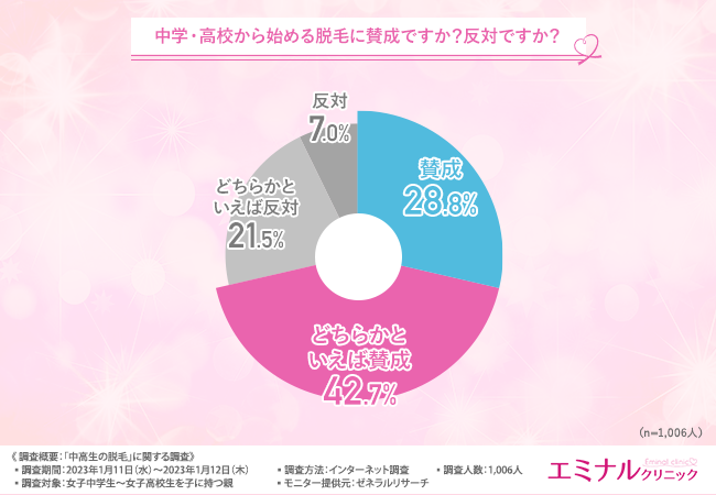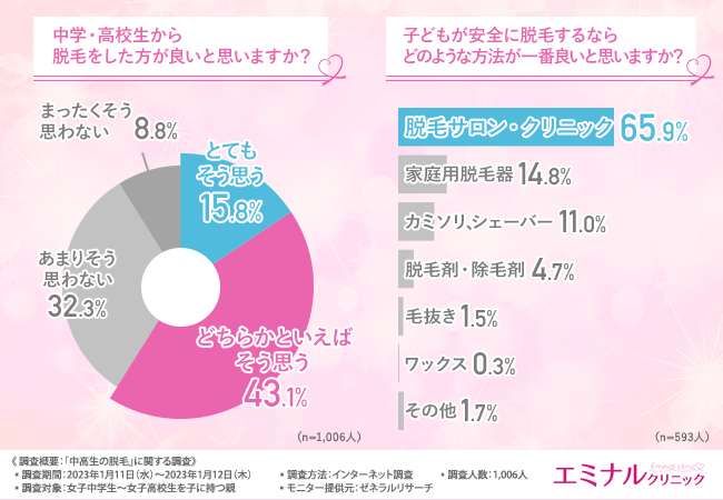 そこで今回、医療脱毛のエミナルクリニック(https://eminal-clinic.jp/lp01/?refmedia=11073)は、女子中学生〜女子高校生を子に持つ親を対象に、「中高生の脱毛」に関する調査を実施しました。