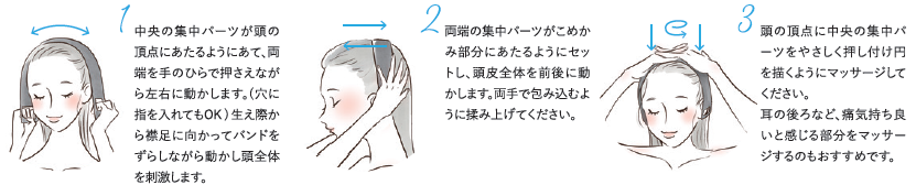 1.中央の集中パーツが頭の頂点にあたるようにあて、両端を手のひらで押さえながら左右に動かします。(穴に指を入れてもOK)生え際から襟足に向かってバンドをずらしながら動かし頭全体を刺激します。
