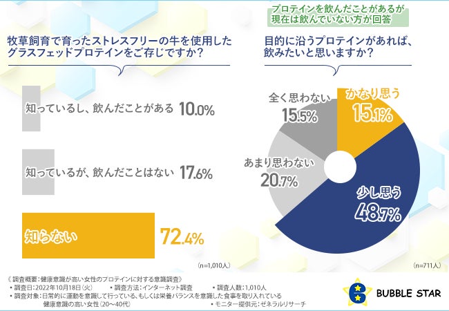 「牧草飼育で育ったストレスフリーの牛を使用したグラスフェッドプロテインをご存じですか?」と質問したところ、『知っているし、飲んだことがある(10.0%)』『知っているが、飲んだことはない(17.6%)』『知らない(72.4%)』という結果になりました。