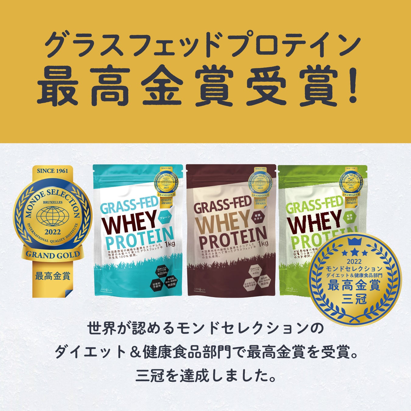 この度、バブルスター株式会社(https://bubblestar.jp/)が企画・製造販売を手掛ける『グラスフェッドホエイプロテイン』は、2022年度モンドセレクションのダイエット&健康食品部門で最高金賞を受賞、3冠を達成致しました。