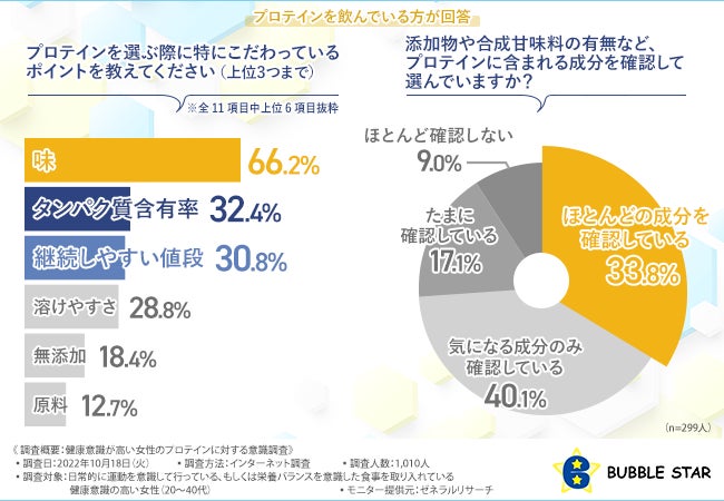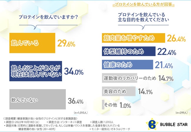 バブルスター株式会社(本社所在地:神奈川県大和市、代表取締役:須藤 晃通)は、日常的に運動を意識して行っている、もしくは栄養バランスを意識した食事を取り入れている健康意識の高い女性(20〜40代)を対象に、健康意識が高い女性のプロテインに対する意識調査を実施しました。
