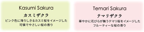 今季は新たにお風呂で春を楽しむ「とろみバスパウダー」「バスソルトバッグ」「バスボム」、桜と一緒に“ありがとう”の想いを届ける「サンクスミニギフト」「バスセット(ブック)」、大島桜エキスを使った「パールハンドソープ」「ボディーソープ」、ホームフレグランスの「インセンススティック」が登場。カスミザクラとテマリザクラをイメージした2種の香りで、おうちに春をお届けします。