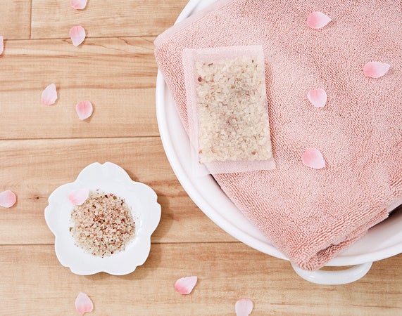 天然の海塩に乾燥したローズヒップの花葉をブレンドしたバスソルト。バッグをそのままお風呂に浮かべて、やさしい桜の香りとゆらめく花葉を楽しむちょっぴり贅沢なバスタイムを。