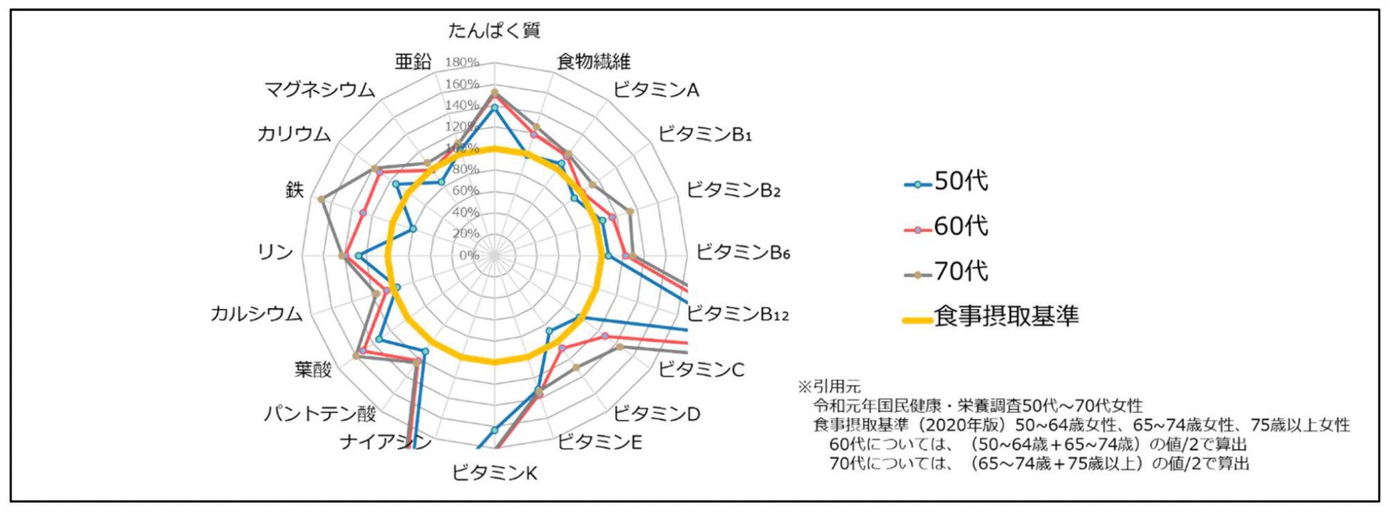※3 日本人の食事摂取基準(2020年版)を100%とした場合の令和元年国民健康・栄養調査栄養素等摂取量に「大人のための粉ミルク おなかにやさしい」20gを摂取した場合の充足率(女性)