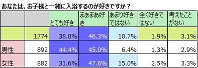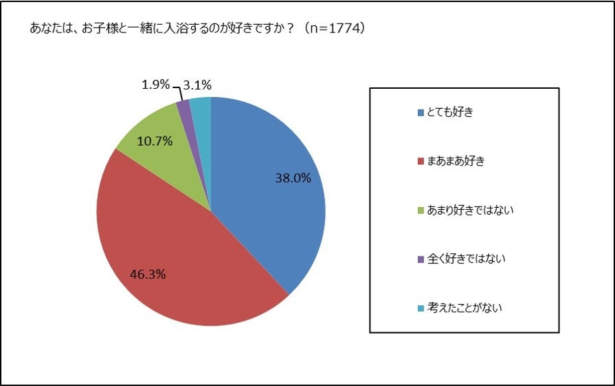 子どもと一緒に入浴している男女、1,774名に子どもと一緒に入浴することが好きか聞きました。「とても好き」38.0%と「まあまあ好き」46.3%を合わせて84.3%の男女が好きだと答えています。