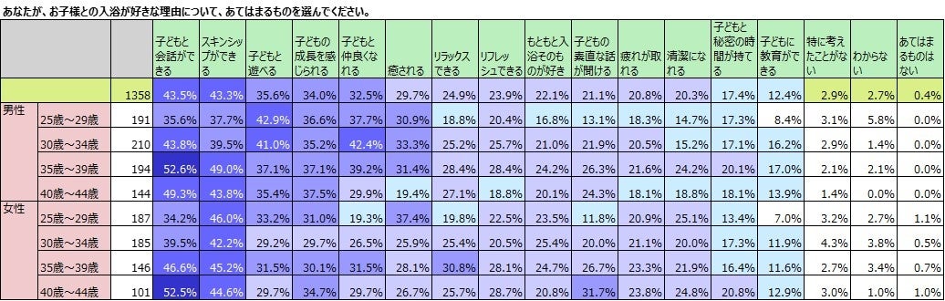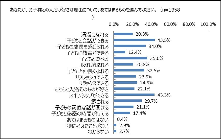 子どもと一緒に入浴することが好きだと答えた男女1,358名に、好きな理由を聞きました。(複数選択のため、合計が100%にはなりません。)上位は、「子どもと会話ができる」43.5%と「スキンシップができる」43.3%で、ほぼ同率で4割以上の男女が選んでいます。続くのは、「子どもと遊べる」35.6%、「子どもの成長を感じられる」34.0%、「子どもと仲良くなれる」32.5%です。「癒される」も、29.7%と約3割の男女が選んでおり、「リラックスできる」24.9%、「リフレッシュできる」23.9%も2割を超える男女が選んでいます。