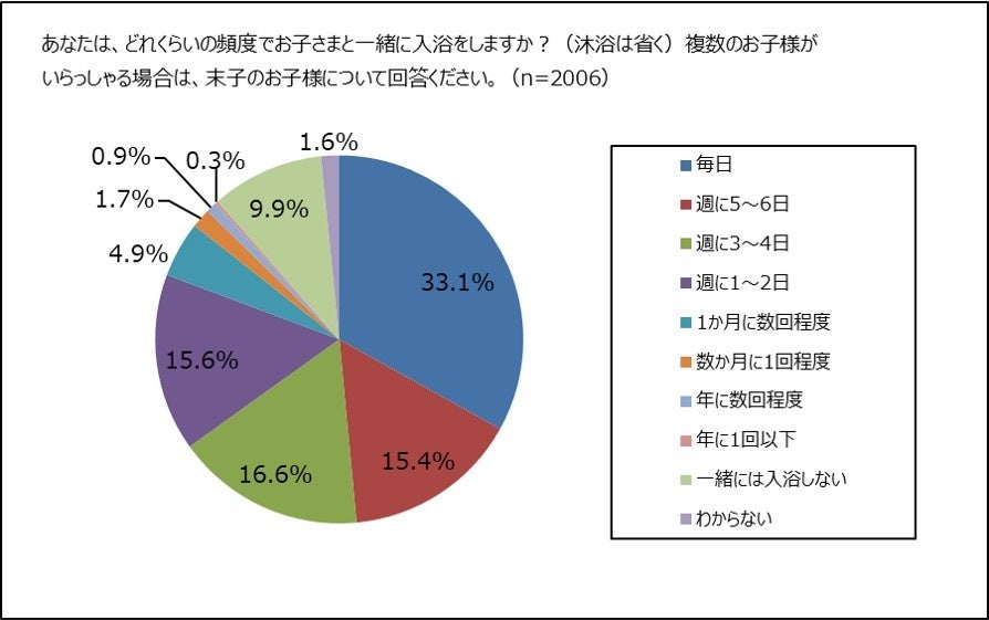 全国の25歳~44歳の12歳以下の子どもを持つ男女2,206名のうち、「子どもと一緒入浴している」と答えたのは、「わからない」1.6%「一緒には入浴しない」9.9%を除く88.5%で、約1割の両親は子どもと一緒に入浴をしていません。(ただし沐浴を除く。)