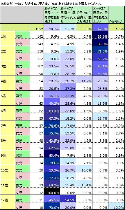 また、①の結果から、子どもがひとりで入浴をし始めるのが7歳が多いことからも、まずは5~6歳で自分ひとりで髪や身体を洗えるようになることが、子どものひとりで入浴ができるようになるステップのように思われます。