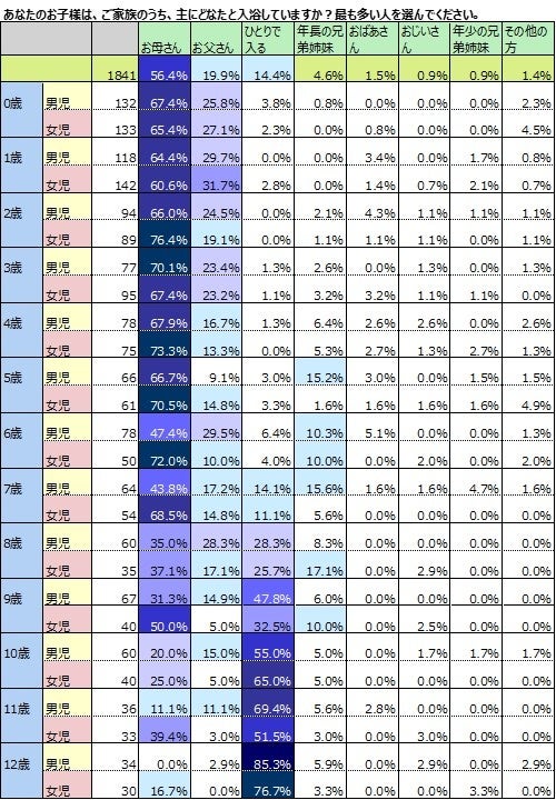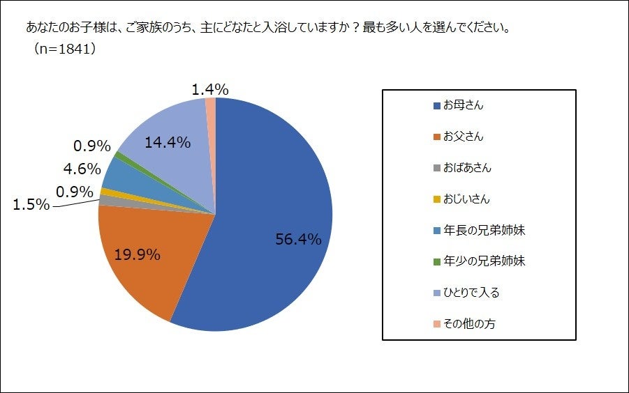 子どもが最も一緒にお風呂に入るのは、「お母さん」で約6割。 性別の異なる両親とお風呂に入らなくなるのは12歳。