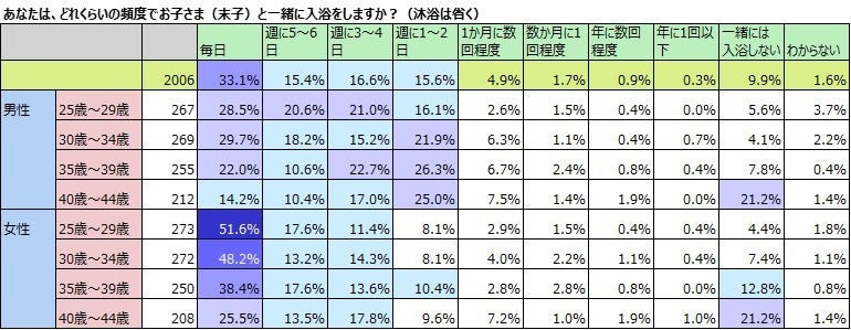 女性も男性と同じ傾向が見られます。20代前半では、51.6%と半数以上の女性が毎日子どもと一緒に入浴していますが、年齢が上がるにつれ一緒に入っている割合が減っていき、40代前半では25.5%と20代後半の51.6%の約半分となります。両親の年齢が若いほど、子どもの年齢も幼い割合が増え、子どもが一人では入浴できないために、一緒に入る場合が多いことや、両親の年齢が高いと、年長の兄弟姉妹がいるために、兄弟姉妹での入浴が増えることも想像できますが、親子の入浴は、子どもの年齢よりも両親の年齢の影響の方が多いようです。全体では、女性の方が子どもと一緒に入浴している割合が高いですが、40代前半の女性では、毎日一緒に入浴しているのは25.5%で、20代後半の男性は28.5%のため、若いパパの方が、子どもと毎日一緒に入浴しています。