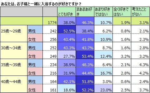一方、女性は20代後半で「とても好き」と「まあまあ好き」がともに約4割です。年齢を重ねるほど、「好き」と答える割合が少なくなり、40代前半になると約7割に減っています。女性はすべての世代で、「あまり好きではない」と答えている人が、1割以上おり、特に40代前半で見てみると、「あまり好きではない」23.0%と「全く好きではない」2.5%を合わせると、25.5%と約3割に迫ります。男性の方が入浴頻度が少ないものの、子どもとの入浴は好きだと答えている割合が多いことがわかりました。