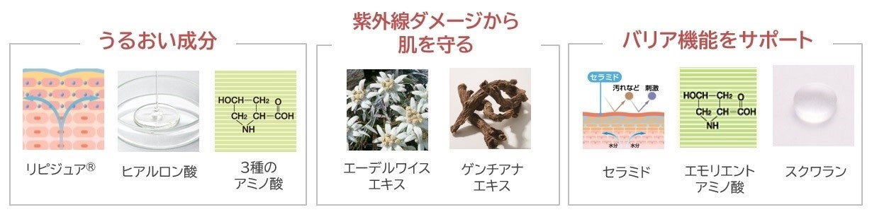「ママ&キッズ サンスクリーンミルク」には美容液のようなスキンケア成分をたっぷりと配合。うるおい成分はもちろん、バリア機能(角層&タイトジャンクション)をサポートする成分も配合。やわらかく軽く伸びる、みずみずしいテクスチャーだからノンストレスで日々のUVケアが完了!