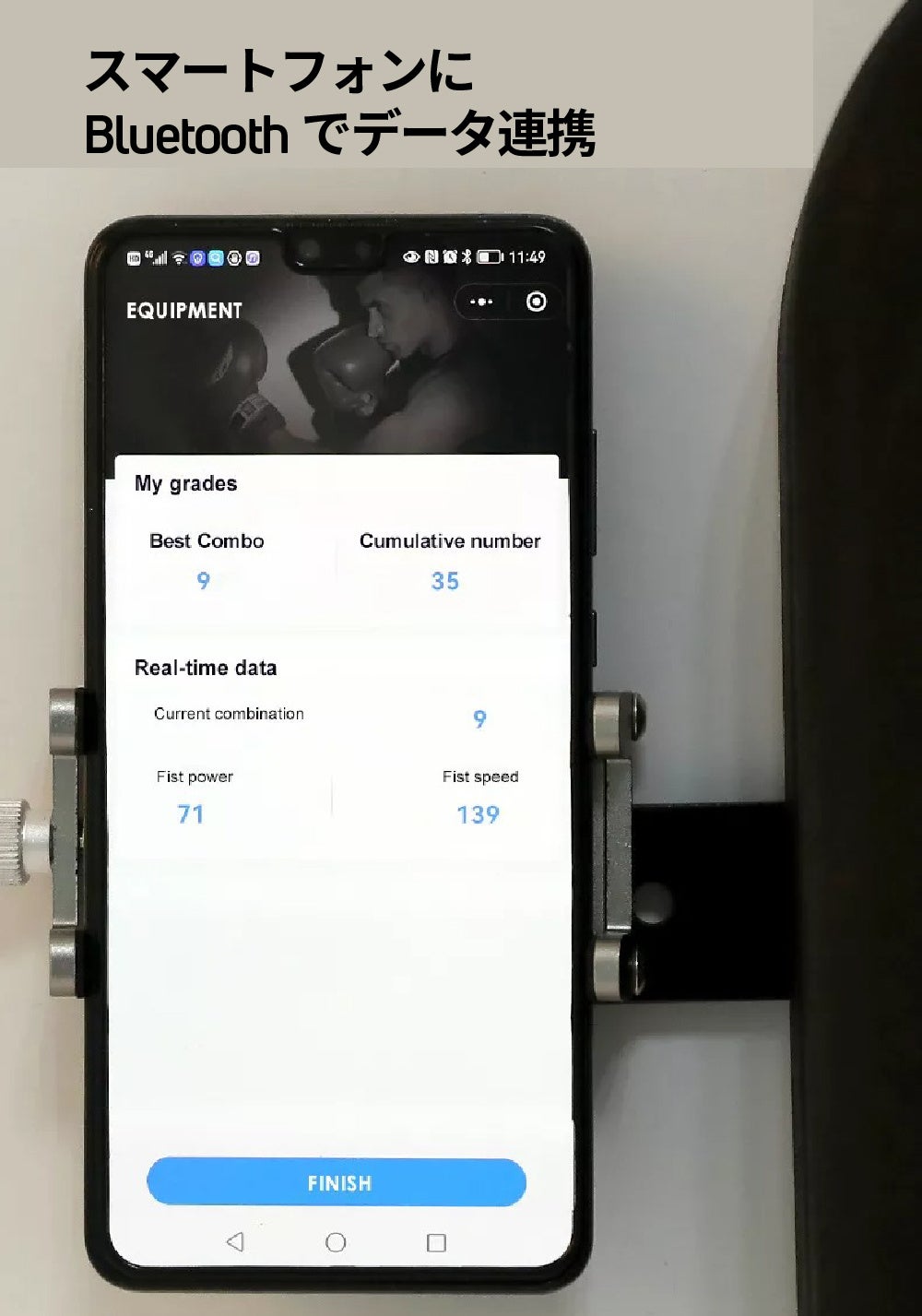 Gymoo-Boxは、スマートフォンとBluetoothで接続してトレーニングデータ共有や音楽再生が可能。