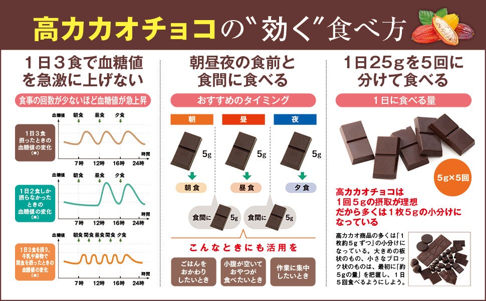 さらに「1日25g。5回に分けて食べる」「朝昼夕の食前と食間に食べる」といったその効果的な食べ方、「高カカオチョコを1日25g×4週間ダイエット」の検証結果も紹介します。