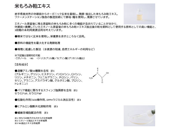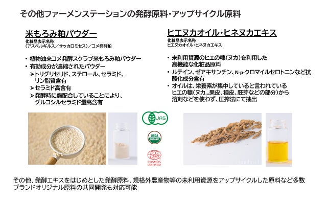 ファーメンステーションでは、今回採用された「米もろみ粕エキス」のほかに、同じく有機JAS認証のオーガニック米由来の米もろみ粕をパウダー化した原料(米もろみ粕パウダー)や未利用資源のヒエヌカ(雑穀のヒエを精製する際に出るヌカ)をアップサイクルした原料、その他各種発酵エキスや外部パートナーとオリジナル発酵原料製造なども手掛けており、発酵技術を活用し素材本来の機能性を引き出した原料化や、規格外の農産物など未利用資源をアップサイクルした原料などの開発も行っております。