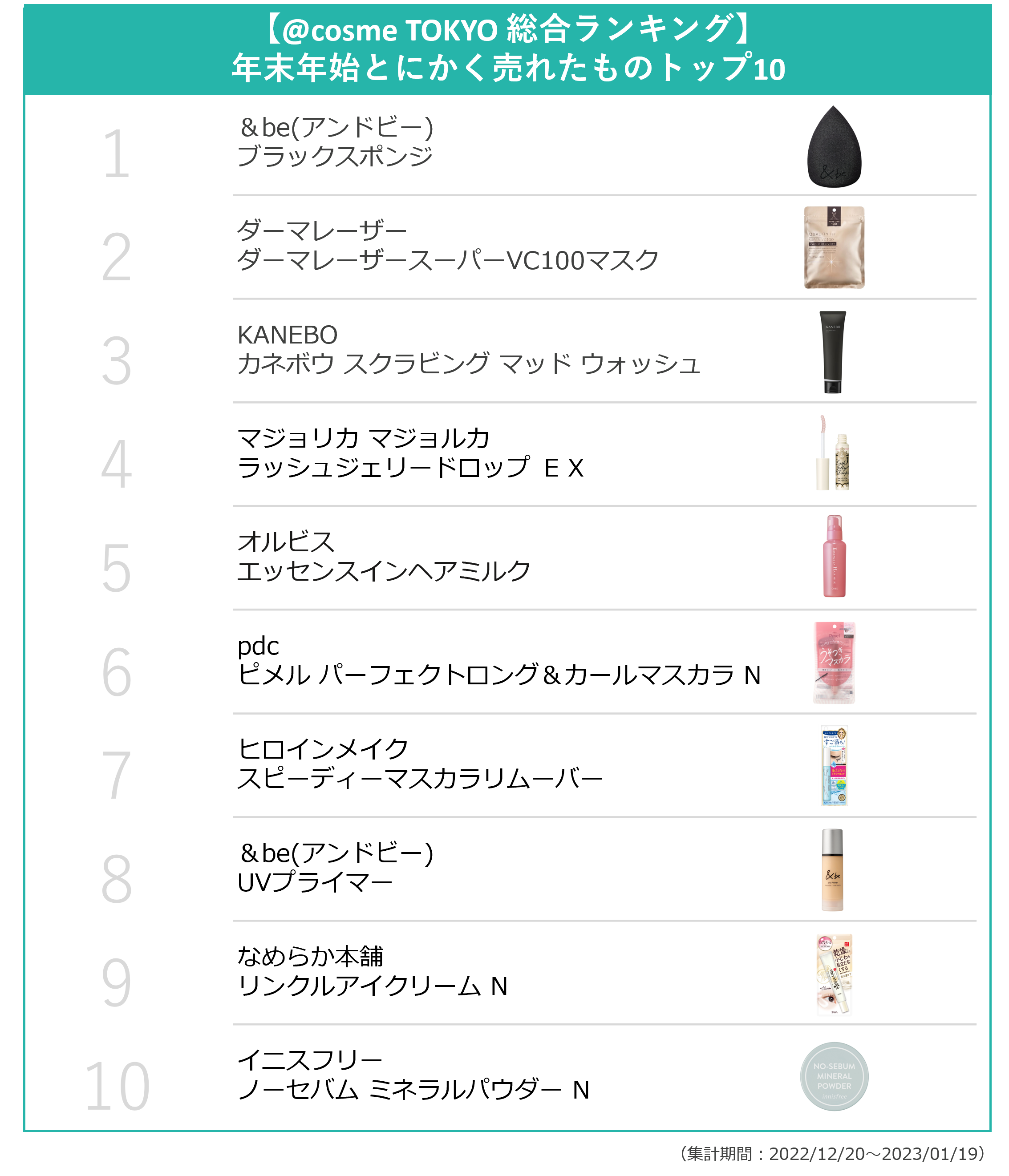 そんな@cosme TOKYOの総合ランキングトップ10にランクインする商品はまさに「とにかく売れたもの」。第1位に輝いたのは人気ヘアメイクアップアーティスト河北氏がプロデュースする&be(アンドビー) のブラックスポンジ。一か月で4000個以上を超える販売数を記録しました。その他には@cosmeベストコスメアワードに受賞した商品や昨年SNSでバズった商品が多くランクインする結果になりました。